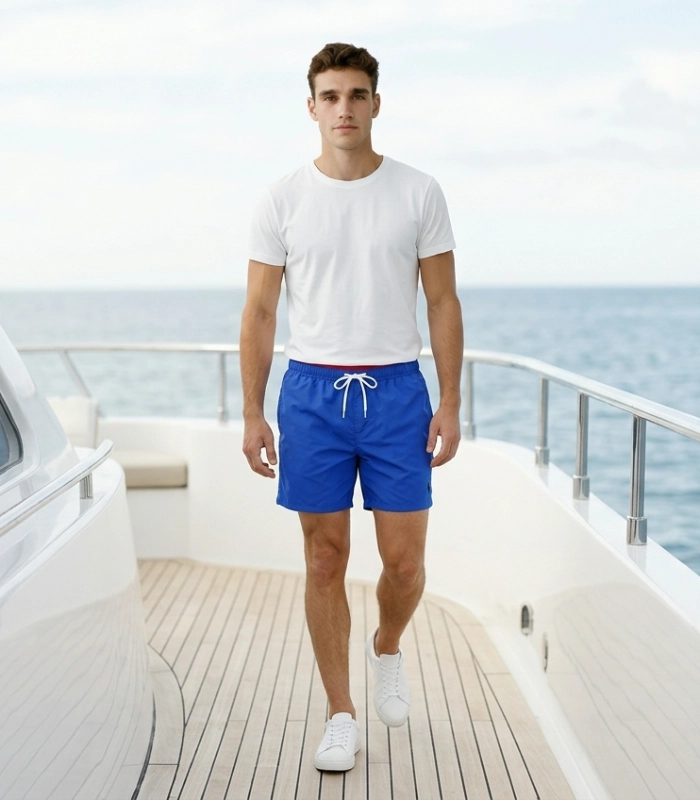 •Side on-seam pockets. Back right buttoned pocket. •Polo Ralph Lauren Swimwear” label at the back pocket.
